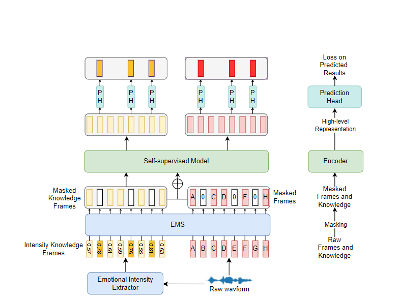 语音自监督学习(SSL)在各种下游任务中显示出相当大的功效。然而,目前流行的自监督模型往往忽略了与情感相关的先验信息,从而忽视了通过语音中的情感先验知识来提高情感任务理解能力的潜力。在本文中,我们提出了一种利用强度知识进行情感感知语音表征学习的方法。具体来说,我们利用已建立的语音情感理解模型提取帧级情感强度。随后,我们提出了一种新颖的情感掩码策略(EMS),将情感强度纳入掩码过程。我们选择了两个基于Transformer和CNN的代表性模型,即MockingJay和非自回归预测编码(NPC),并在IEMOCAP数据集上进行了实验。实验证明,在SER任务中,我们提出的方法所得到的表示优于原始模型。