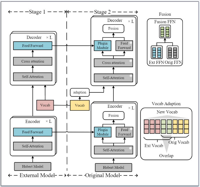 多语言语音翻译任务通常采用重新训练、正则化或重采样方法来添加新语言。重新训练模型会显著增加训练时间和成本。此外,使用现有的正则化或重采样方法来平衡新语言和原始语言之间的性能可能会导致灾难性的遗忘。这会降低现有语言的翻译性能。为了缓解上述问题,我们将新语言的知识存储在其他模型中。然后,我们将它们作为可插入模块引入现有的多语言语音翻译模型中。这种方法不会显著增加训练成本,也不会影响现有模型的翻译性能。实验结果表明,我们的方法提高了新语言的翻译性能,而不会影响现有的翻译任务。