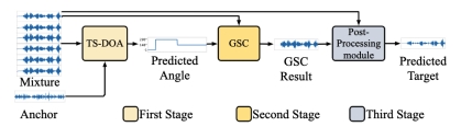 目标说话人提取(TSE)旨在根据注册样本从多个混合说话人中分离出特定的声音。由于声纹特征通常变化很大,当前的端到端神经网络需要大量的模型参数,庞大的计算复杂度对于实时应用来说是不切实际的,特别是在资源受限的平台上。 在本文中,我们使用麦克风阵列解决 TSE 任务,并引入一种新颖的三阶段解决方案,系统地解耦该过程,降低任务难度:首先,训练神经网络来估计目标说话者的方向。第二步,确定方向后,使用广义旁瓣消除器(GSC)提取目标语音。 第三,就地卷积循环神经网络 (ICRN) 充当去噪后处理器,改进 GSC 输出以产生最终的分离语音。 我们的方法提供了卓越的性能,同时大大减少了计算负载,为高效的实时目标说话人提取树立了新标准。