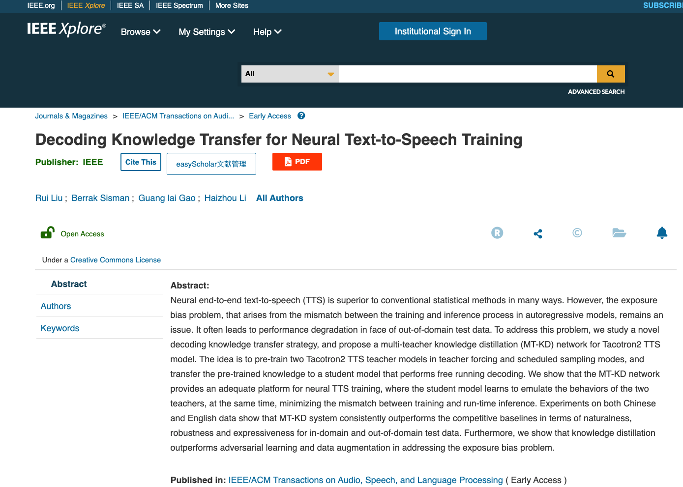 该论文针对语音合成的鲁棒性、表现力建模问题开展研究,提出了一种多教师知识蒸馏学习的语音合成声学建模方法。我校太阳成集团tyc522cc刘瑞研究员为该论文第一作者,高光来教授为论文通讯作者,suncitygroup太阳集团为该论文第一作者和通讯作者单位。