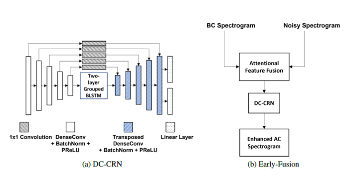 骨传导 (BC) 麦克风通过将人类头骨的振动转换为电信号来捕获语音信号。 BC 传感器对噪声不敏感,但带宽有限。 另一方面,传统或空气传导 (AC) 麦克风能够捕获全频带语音,但容易受到背景噪音。 我们通过使用执行复杂频谱映射的卷积循环网络结合 AC 和 BC 麦克风的优势。 为了更好地利用来自两种麦克风的信号,我们采用了基于注意力的融合以及早期融合和晚期融合策略。 实验证明了所提出的方法优于其他最近结合 BC 和 AC 信号的语音增强方法。 此外,我们的增强性能明显优于传统的语音增强对应物,尤其是在低信噪比场景中。