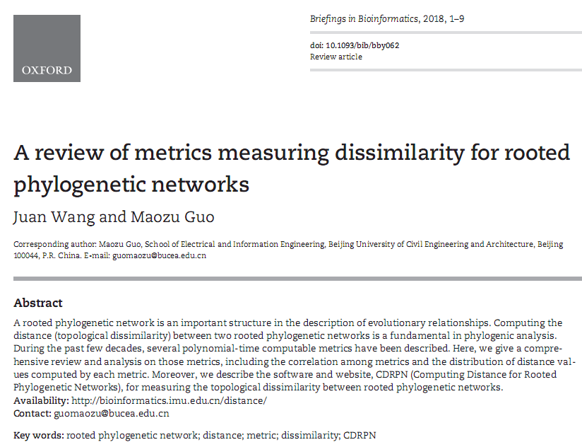 2018年7月17日我院王娟副教授在国际顶级期刊《Briefings in Bioinformatics》发表了《A review of metrics measuring dissimilarity for rooted phylogenetic networks》(原文链接:https://academic.oup.com/bib/advance-article/doi/10.1093/bib/bby062/5055373)。