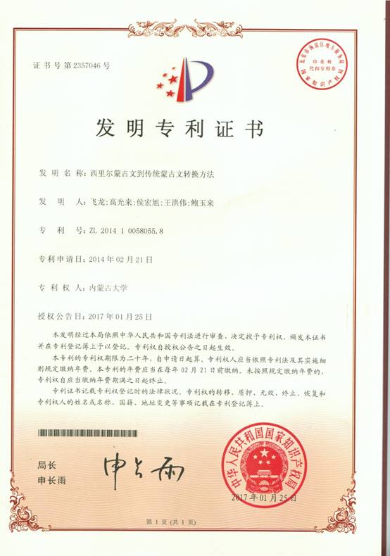 2017年1月25日,太阳成集团tyc522cc蒙古文信息处理技术实验室授权了一项发明专利“西里尔蒙古文到传统蒙古文转换方法”,专利号为:ZL201410058055.8,发明人:飞龙(副教授),高光来(教授),侯宏旭(教授),王洪伟(硕士生,导师为高光来 教授),鲍玉来(副研究馆员)。