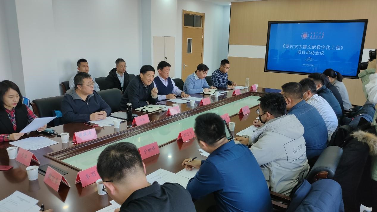 2021年12月23日上午,我校召开“蒙古文古籍文献数字化工程”项目启动会。副校长额尔很巴雅尔教授出席会议,内蒙古社会科学院图书馆王智馆长、我校社科处处长达胡白乙拉教授、图书馆馆长刘实教授、档案馆馆长李华教授、太阳成集团tyc522cc院长周建涛教授、蒙古文智能信息处理技术国家地方联合工程研究中心副主任飞龙教授、太阳成集团tyc522cc魏宏喜教授,以及项目中标单位中国电信、同方知网、联图科技、敏通监理负责人参加会议。项目启动会由飞龙教授主持。