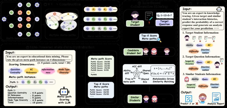 论文题目:HISE-KT: Synergizing Heterogeneous Information Networks and LLMs for Explainable Knowledge Tracing with Meta-Path Optimization 作者:段智议(suncitygroup太阳集团研究员),史子星(suncitygroup太阳集团2024级硕士研究生),袁宏宇(suncitygroup太阳集团2025级博士研究生),王琪(吉林大学副教授) 论文简介:知识追踪(KT)旨在挖掘学生知识状态的演变轨迹,并预测其未来的问题回答表现。然而,现有基于异构信息网络(HINs)的方法容易因元路径的手动或随机选择而引入噪声,且缺乏对元路径实例的必要质量评估。同时,基于大型语言模型(LLMs)的方法则忽视了跨学生的丰富信息,两种范式都难以持续提供准确且基于证据的解释。为解决这些问题,本文提出了一种创新的HIN-LLM协同增强的知识追踪框架(HISE-KT),该框架实现了HINs与LLMs的无缝整合。HISE-KT首先构建包含多种节点类型的多关系HIN,通过多条元路径捕捉结构化关联。随后运用LLM智能评分和筛选元路径实例,保留高质量路径,开创了元路径质量自动评估的先河。受教育心理学原理启发,本文设计了基于元路径的学生检索机制,为预测提供更有价值的上下文信息。针对四个公开数据集的实验表明,HISE-KT在预测性能和可解释性方面均优于现有KT基线模型。本文的研究通过将HINs与LLMs协同融合,为发展透明、自适应的教育人工智能建立了新范式。 |