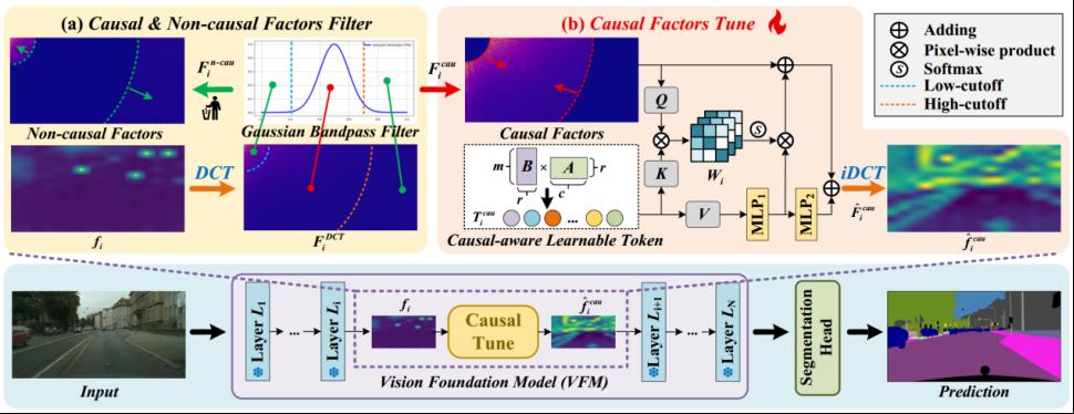 论文题目:Causal-Tune: Mining Causal Factors from Vision Foundation Models for Domain Generalized Semantic Segmentation 作者:张印(哈尔滨工业大学21级博士生),张永强(suncitygroup太阳集团 研究员),郑尧月(西安交通大学21级博士生),Bogdan Raducanu(巴塞罗那自治大学),刘丹(哈尔滨工业大学) 单位:哈尔滨工业大学仪器科学与工程学院,巴塞罗那自治大学计算机视觉中心,太阳成集团tyc522cc 论文简介:在域泛化语义分割(Domain Generalized Semantic Segmentation, DGSS)任务中,仅微调视觉基础模型(Vision Foundation Models, VFMs)的少量参数就可以显著的提升DGSS的性能。现有的方法通常通过训练轻量级adapters或优化中间层特征来提升模型在未知域上的泛化能力。然而,这些方法往往忽视了一个关键问题:预训练的VFMs常常会产生特征伪影,这些伪影会阻碍VFMs中有价值feature的利用,从而削弱DGSS的性能。受因果机制的启发,本文发现这些伪影与非因果因素相关,而这些非因果因素通常存在于VFMs特征谱的低频和高频部分。本文针对DGSS任务,显式地分析了VFMs特征中的因果与非因果因素,并提出了一种简洁而高效的方法来识别并解耦二者,从而实现更稳健的域泛化。为此,本文提出了Causal-Tune——一种新颖的微调策略,旨在从VFMs特征中提取因果因素并抑制非因果因素。首先,本方法利用离散余弦变换(Discrete Cosine Transform, DCT)提取每一层特征的频谱;随后,采用高斯带通滤波器将频谱划分为因果与非因果部分。为了进一步优化因果部分,本方法在频域中引入了一组因果感知的可学习tokens来进行特征增强,而非因果部分则被丢弃。最后,将优化后的因果特征通过逆DCT转换回空间域,并输入下一层。本方法在大量跨域实验中验证了Causal-Tune的有效性,尤其在恶劣天气条件下表现突出,如雪天场景中相比基线方法mIoU提升了4.8%。 |