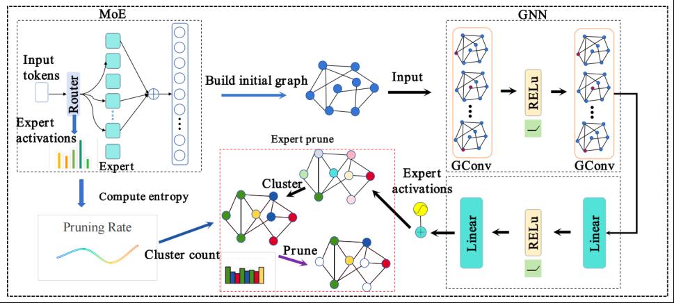 论文题目:C-GNN-PRUNE: A Unified Graph-Based Framework for Structure-Aware Pruning of Mixture-of-Experts Models 作者:李林(suncitygroup太阳集团24级硕士研究生)、王燕(suncitygroup太阳集团 副教授)(通讯作者)、王卓鹏(suncitygroup太阳集团24级硕士研究生) 论文简介:稀疏专家混合(MoE)结构在扩展大型语言模型(LLMs)方面展现出卓越的计算效率,但其庞大的参数规模仍然制约了部署效率。现有剪枝方法多忽视专家间的结构依赖与层间异质性,导致剪枝后性能退化与结构破坏。针对上述问题,本文提出统一的结构感知剪枝框架 C-GNN-PRUNE,通过图神经网络(GNN)建模专家间的交互关系,实现基于结构的专家选择与压缩。该框架首先设计基于熵的层级剪枝分配策略,根据专家激活分布熵自适应分配剪枝预算;随后构建专家交互图,融合输出相似度与路由差异信息,经由两阶段GNN学习结构感知嵌入;再通过社区检测机制识别功能冗余的专家簇,并在簇内基于激活频率执行保留与裁剪,从而在稀疏性与表达力间取得平衡。在 DeepSeek-V2-Lite、Qwen1.5-MoE-A2.7B 与 Mixtral-8×7B 三个开源模型上的实验结果表明,C-GNN-PRUNE 在不同剪枝率下均能显著提升压缩后的模型性能稳定性与任务泛化能力。与 C-PRUNE、EEMoE、Wanda 等方法相比,本方法在平均任务精度上最高提升达 4.3 个百分点,在保持高压缩比的同时有效维持模型表达多样性。该研究为实现结构保持、低资源开销的 MoE 模型压缩提供了一种统一且可扩展的解决方案。 |