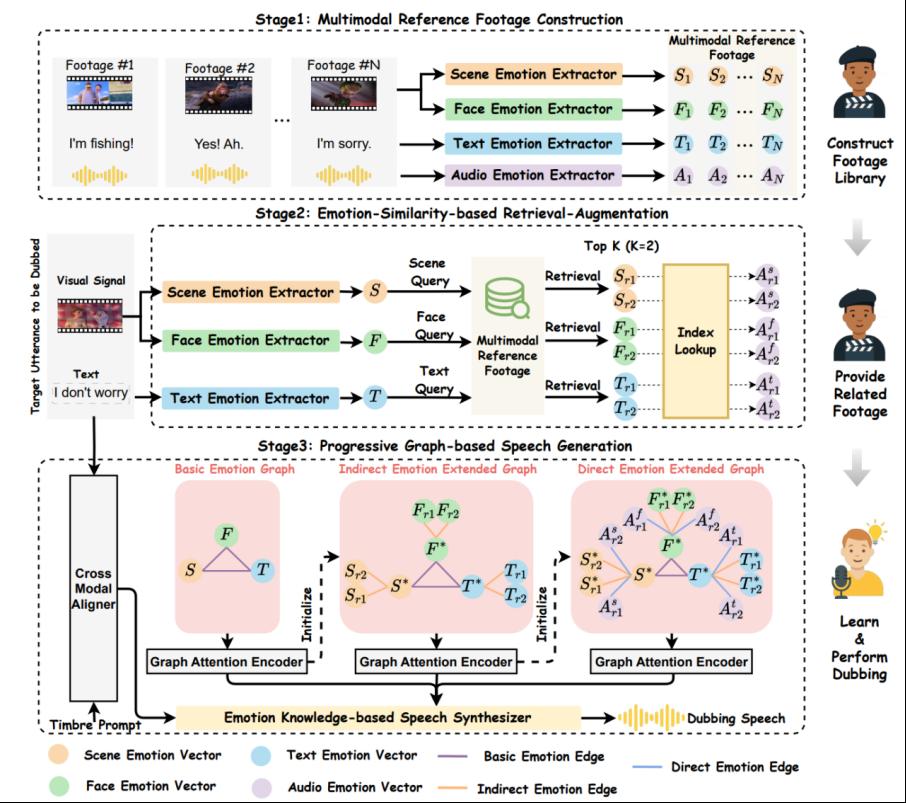 论文题目:Towards Authentic Movie Dubbing with Retrieve-Augmented Director-Actor Interaction Learning 作者:刘瑞(suncitygroup太阳集团 教授)、赵源(suncitygroup太阳集团25级博士研究生)、贾真琦(suncitygroup太阳集团25级博士研究生) 论文简介:自动电影配音模型能根据给定剧本生成生动语音,通过简短的音色提示还原说话 人的音色,同时确保与无声视频的口型同步。现有方法模拟了演员直接配音且无需准备的简化流程,忽略了关键的导演- 演员互动环节。相比之下,真实配音流程涉及动态协作:导演会积极与演员沟通,引导他们在配音前内化语境线索,尤其是情感层面的线索。为解决这一问题,我们提出一种新的检索增强型导演 - 演员互动学习方案,以实现真实感电影配音,该方案被命名为Authentic-Dubber,包含三大创新机制:(1)构建多模态参考素材库,模拟导演提供的学习素材。通过整合大型语言模型(LLMs),实现对跨模态信号情感表征的深度理解。(2)提出基于情感相似度的检索增强策略,模拟演员在配音过程中高效、全面内化导演提供素材的过程。该策略会检索与目标无声视频最相关的多模态信息。(3)开发基于渐进式图结构的语音生成方法,逐步融入检索到的多模态情感知识,从而模拟演员的最终配音过程。上述机制使Authentic-Dubber 能够忠实复刻真实配音流程,在情感表现力上实现全面提升。在 V2C-Animation 基准数据集上的主观和客观评估均验证了该方案的有效性。 |
