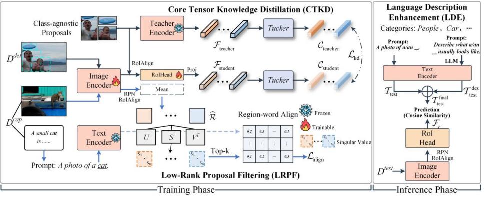 论文题目:Tensor Decomposition and Language Description for Open-Vocabulary Object Detection 作者:梁秋雨(suncitygroup太阳集团24级博士研究生),张永强(suncitygroup太阳集团)(通讯作者) 论文简介:开放词汇目标检测(Open-vocabulary Object Detection,OVOD)旨在突破固定类别限制,实现对未见目标的检测与识别。虽然现有研究基于区域-词语对齐(region-word alignment)和知识蒸馏(knowledge distillation)方面取得了进展,但其性能仍受三大问题制约:区域与词语对齐不精确、知识蒸馏存在冗余传递,以及类别嵌入表示质量较低。针对上述问题,本文提出了一种结合张量分解(Tensor decomposition)与语言描述(Language descriptions)的新颖的开放词汇目标检测框架,TLDet。在传统方法中,最高相似度得分的候选框常聚焦于判别性强但局部不完整的区域(如仅包含目标头部),导致区域-词语对齐偏差。为此,本文提出了低秩候选框筛选模块,通过奇异值分解计算候选框特征矩阵的奇异值之和,定量衡量其结构完整性,从而筛除判别性强但不完整的区域,显著提升视觉区域与文本语义之间的对齐精度。为避免知识蒸馏过程中的信息冗余,TLDet进一步引入核心张量蒸馏方法。该方法基于 Tucker 分解,将教师模型与学生模型的特征映射为核心张量,通过核心张量的优化对齐,实现高效且有选择性的知识迁移,使学生模型能够聚焦于教师模型中的关键特征表示。此外,为增强类别语义嵌入的表达能力,本文设计了语言描述增强机制。该机制在推理阶段引入大语言模型(LLM)的语义知识,通过生成丰富的类别语言描述,弥补开放词汇场景中长尾类别和模糊类别的语义缺失问题,从而提升类别嵌入的区分性与泛化能力。在 COCO 与 LVIS 主流开放词汇目标检测数据集上的实验结果表明,TLDet 在新类别检测任务中表现突出,分别取得 36.1% 的 mAP 和 30.1% 的 mask mAP,显著超越现有开放词汇检测方法,验证了其在开放世界视觉理解中的有效性与优越性能。 |