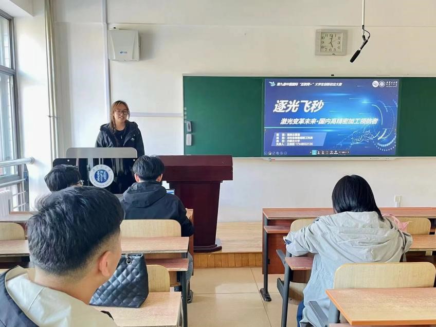 物理科学与技术学院王微微和郑冬生同学介绍了他们在“互联网+”大学生创新创业大赛的参赛项目《逐光飞秒——高精密加工飞秒激光装备领航者》。