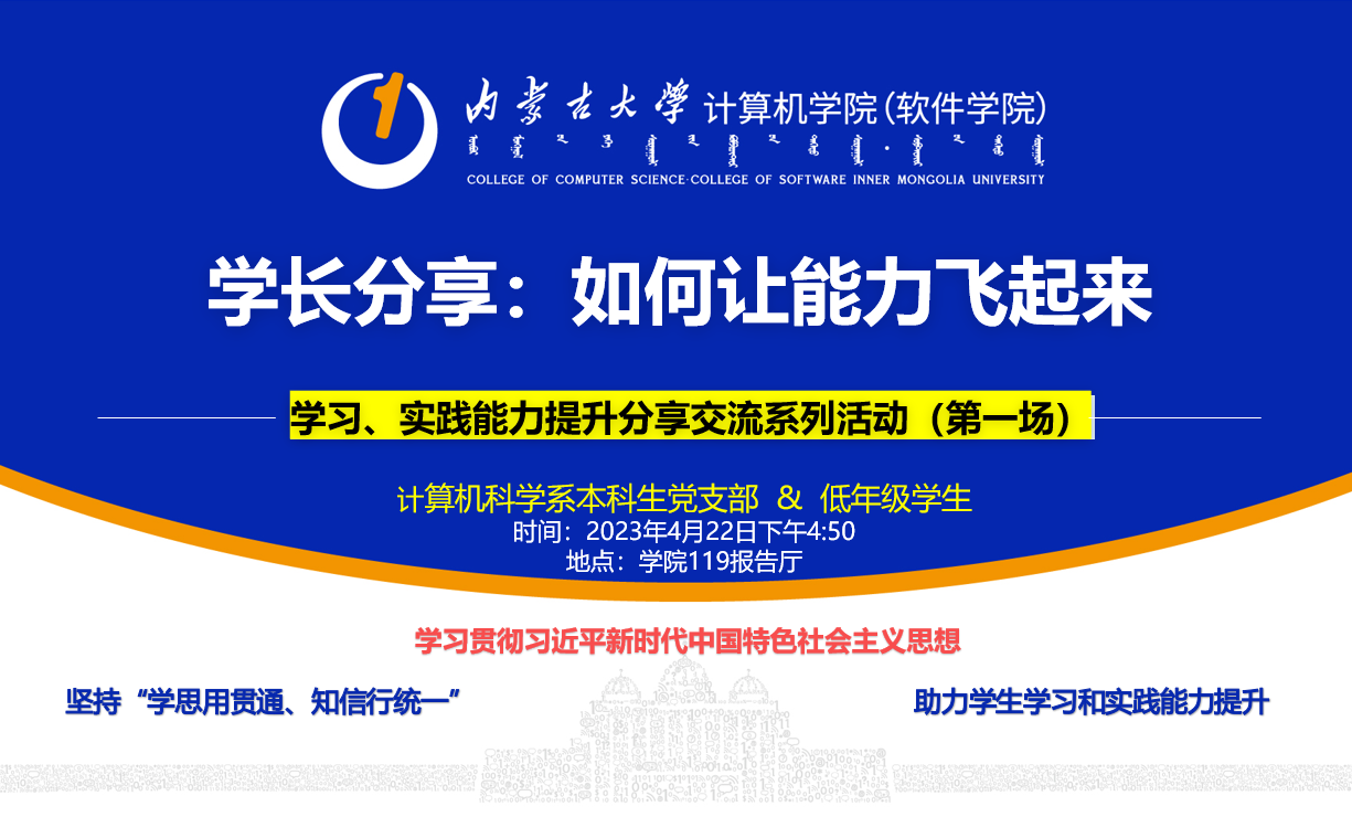 为深入学习贯彻习近平新时代中国特色社会主义思想,积极开展学习贯彻习近平新时代中国特色社会主义思想主题教育工作,计算机科学系本科生党支部以服务学生为本,于2023年4月22日下午在学院119报告厅举办了“学长分享:如何让能力飞起来——学习实践能力提升分享会”。活动邀请学业成绩优秀和实践能力突出的学长进行分享,进一步提高低年级同学对专业学习和实践能力培养重要性的认识,激发同学们的学习实践热情。活动由支部书记卢慧老师主持,党支部成员和低年级学生参加了本次活动。