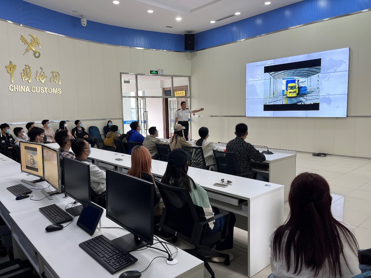 海关关员向同学们详细介绍了我国自主研发的海关“电子眼”——大型集装箱检查系统(H986),参观了呼和浩特海关技术中心生物、化学实验室。