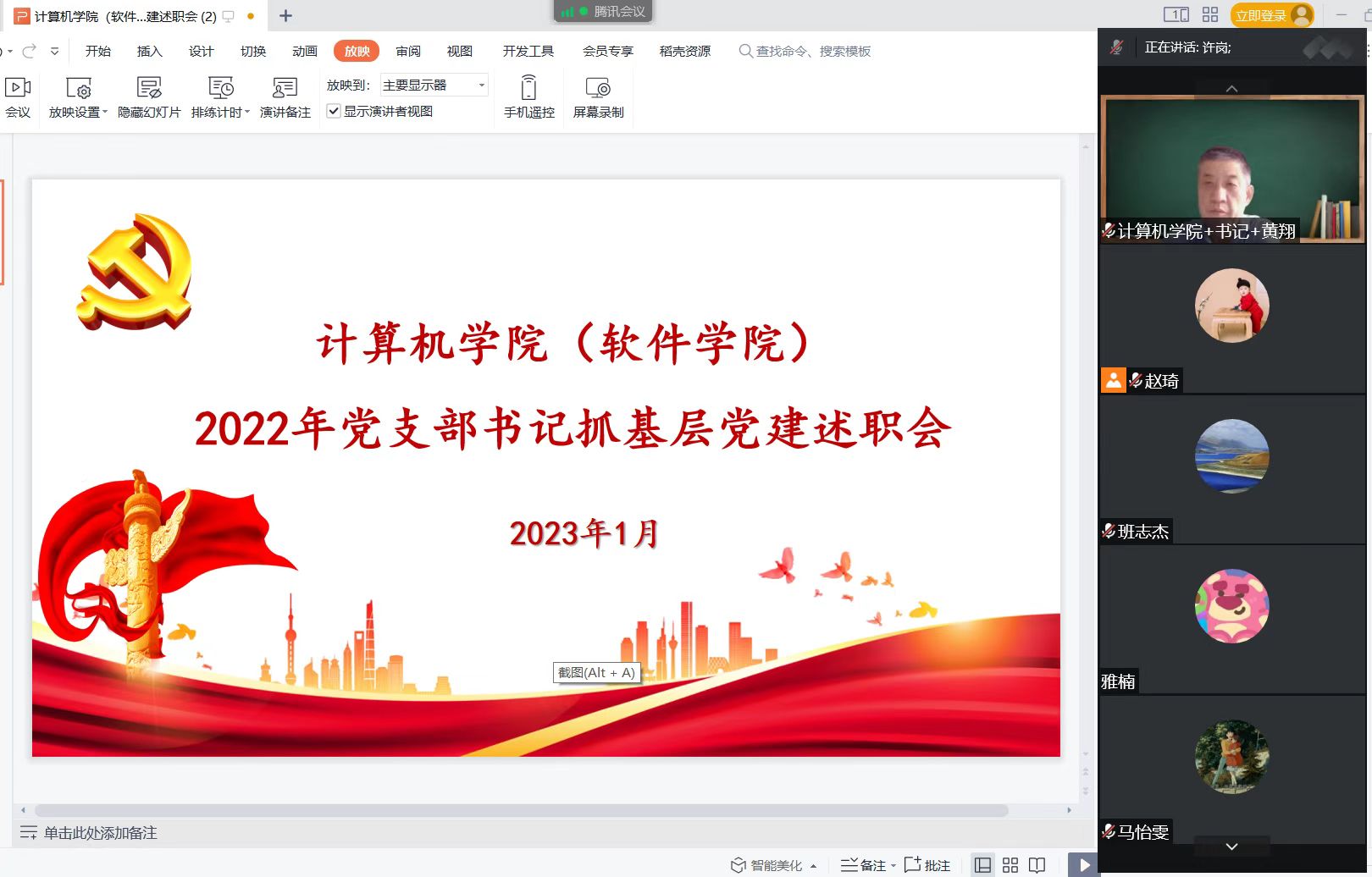 2023年1月5日下午3:00,学院党委采取线上方式召开2022年度党支部书记抓基层党建工作述职评议会,会议由学院党委书记黄翔主持。学院教工、研究生、本科生共7个党支部书记进行了年度党建工作述职和评议。各党支部委员会委员、教师和学生党员代表参加了会议。